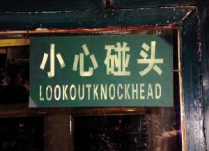 曾經(jīng)就有一位英國(guó)游客在頤和園游覽時(shí),看到一個(gè)牌子,上面寫著“LOOK OUT KNOCK HEAD”(本來想表達(dá)的是“當(dāng)心碰頭”),結(jié)果這位可愛的游客誤認(rèn)為這是一則尋人啟事(尋找諾克·黑德)并將其拍了下來并發(fā)給了英國(guó)的報(bào)社。結(jié)果該牌子一經(jīng)報(bào)社刊登, 馬上就有不少人在網(wǎng)上發(fā)問:“你是誰,為什么要找諾克·黑德?”“諾克·黑德正在泰國(guó)旅游,有什么事找他?”等等。可見,“小心碰頭”的錯(cuò)誤英譯鬧了一個(gè)頗大的國(guó)際笑話。其實(shí),這一警示語的正確英譯應(yīng)該為“Mind your head”或“Watch your head”。這樣,講英語的老外就不會(huì)誤解了。